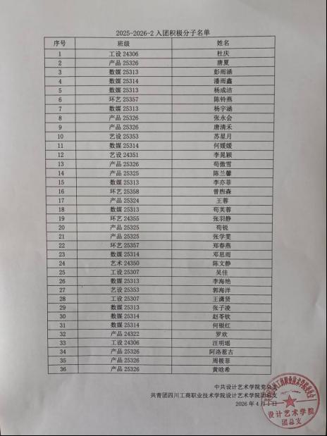 根据川工商院团〔2025〕3号文件要求,现将本学期设计艺术学院入团积极分子名单公示如下: